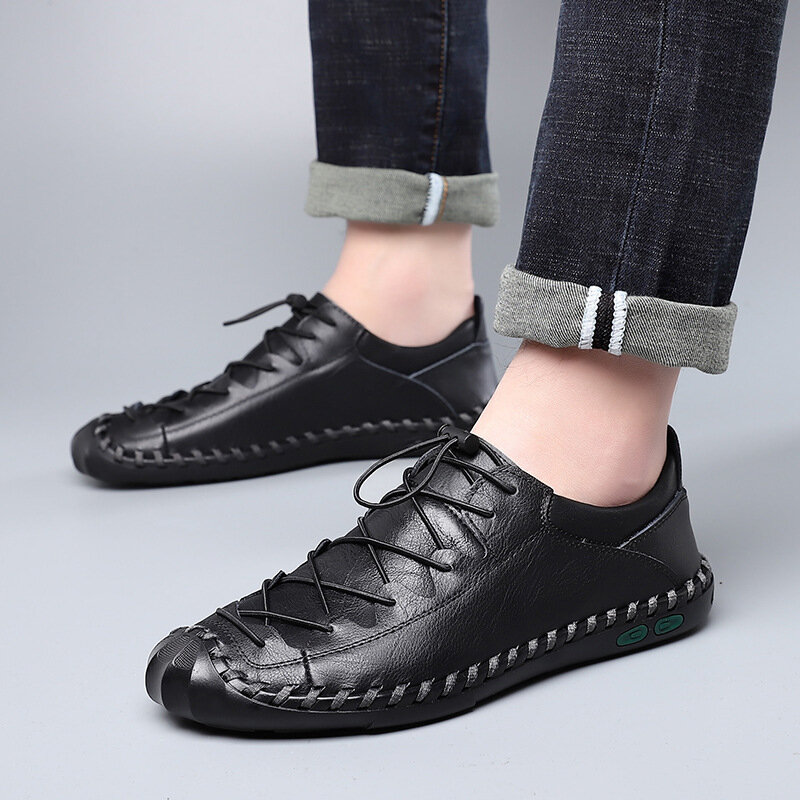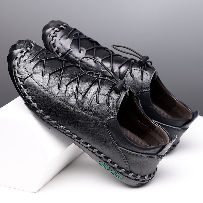 Men Cowhide Hand Stitching Breathable Soft Bottom Elastic Band Casual Business Shoes