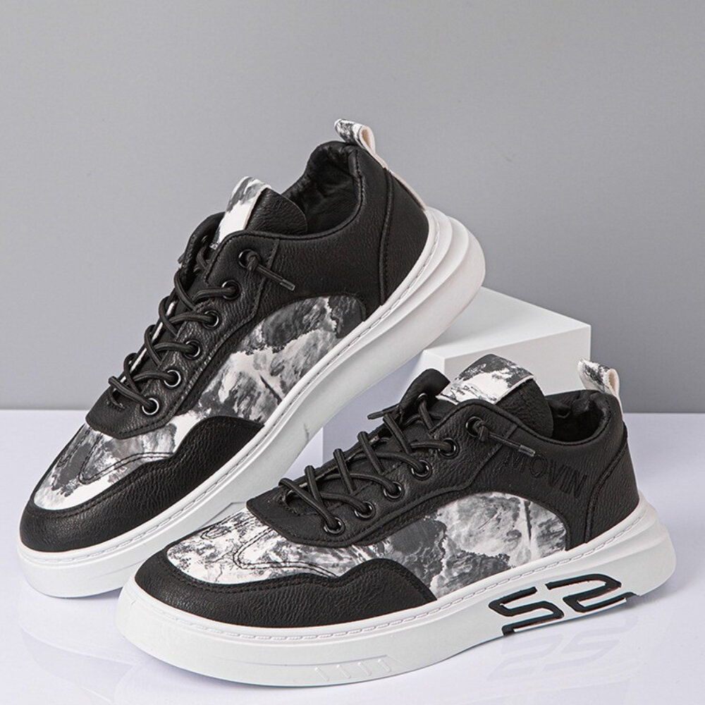 Men Leather Breathable Soft Sole Brief Pattern Lace Up Platform Comfy Court Shoes